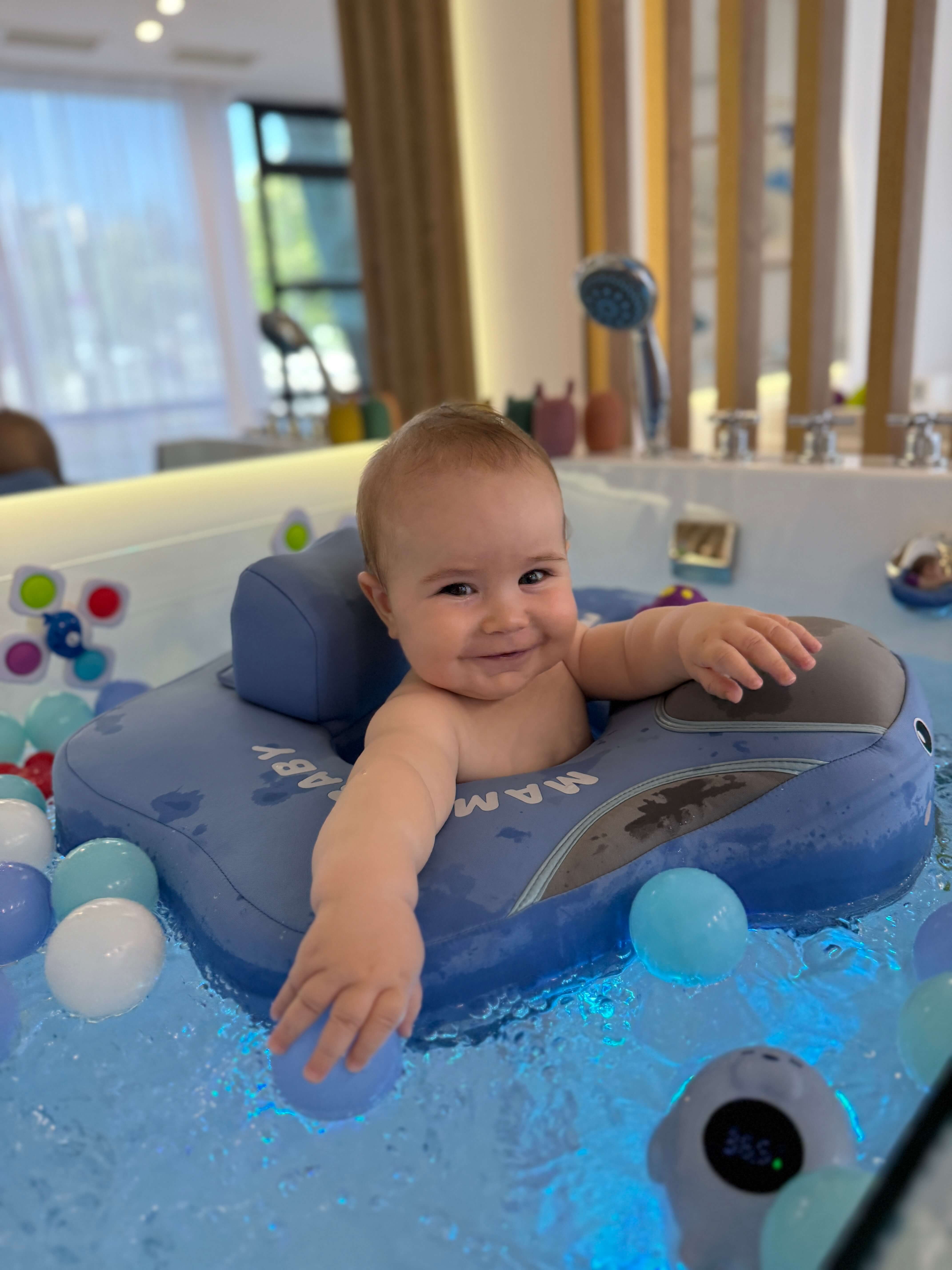 Плаване в специално създадена вана с температура на водата между 36 и 37,5°C предлага много повече от приятно усещане. Това е спокойна и защитена среда, в която бебето се движи свободно, укрепва тялото си и развива своята координация и баланс.
